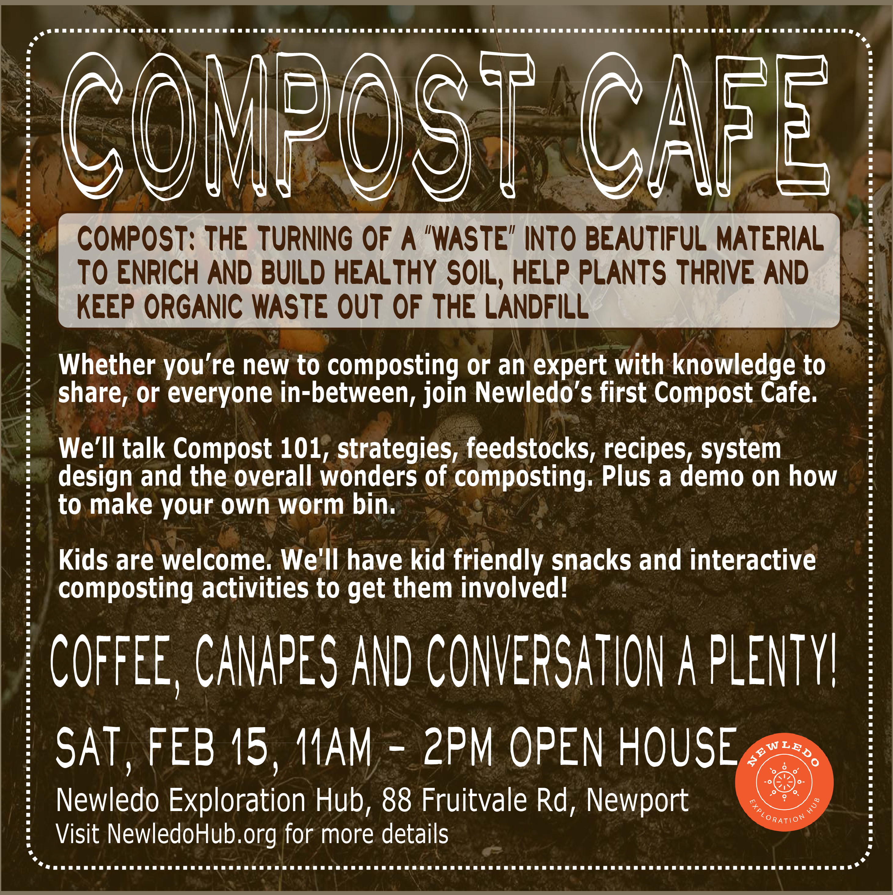 Kids are welcome. We'll have kid friendly snacks and interactive composting activities to get them